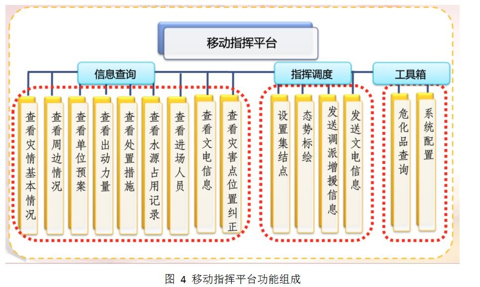 移動指揮平臺作為支隊及以上指揮員輔助指揮與決策的工具,主要包括信息查詢、指揮調(diào)度以及工具箱三部分功能。其中信息查詢主要包括查詢案件信息的相關(guān)功能,指揮調(diào)度主要包括發(fā)送指令的相關(guān)功能,工具箱包括?;凡樵兒拖到y(tǒng)配置。移動指揮平臺的功能組成如下圖所示:
