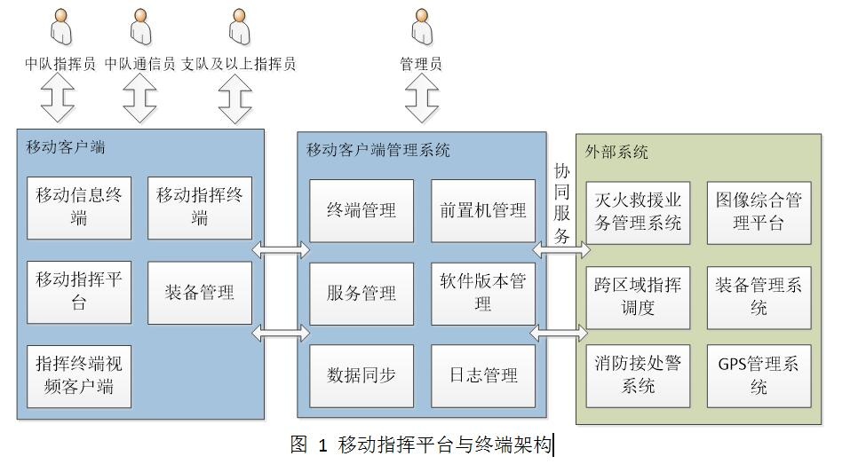 移動指揮平臺及終端與指揮網(wǎng)現(xiàn)有的業(yè)務(wù)管理系統(tǒng)、跨區(qū)域指揮調(diào)度系統(tǒng)、消防接處警系統(tǒng)、圖像綜合管理平臺、裝備管理系統(tǒng)以及GPS管理系統(tǒng)對接,實現(xiàn)了消息的互通,整體架構(gòu)如下圖所示: