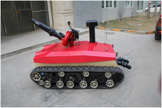 防爆消防滅火偵察機(jī)器人采用耐高溫履帶避震式底盤設(shè)計(jì),能夠適應(yīng)救援環(huán)境中各種復(fù)雜地面。裝配環(huán)境檢測裝置,在滅火的同時(shí)對現(xiàn)場環(huán)境數(shù)據(jù)進(jìn)行偵測。機(jī)器人由機(jī)器人主體,消防炮,環(huán)境檢測裝置,遙控箱四部分組成。主要作用是代替消防隊(duì)員進(jìn)入易燃易爆、有毒、缺氧、濃煙等危險(xiǎn)災(zāi)害事故現(xiàn)場實(shí)施有效的滅火救援、化學(xué)檢測和火場偵察。