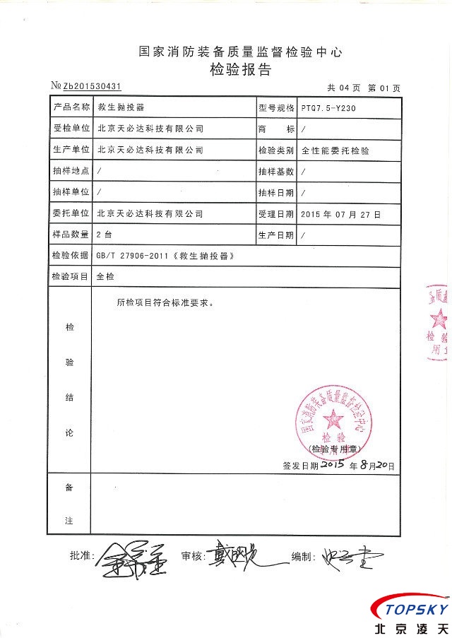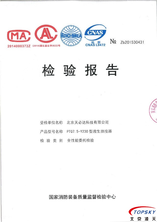 PTQ7.5-Y230型氣動(dòng)遠(yuǎn)距離救生拋投器取得消防檢測(cè)報(bào)告。
