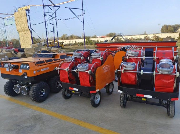 供排水機(jī)器人配有大口徑水帶收放車,采用電動(dòng)快速鋪設(shè)系統(tǒng),操作簡(jiǎn)單,實(shí)用性強(qiáng)等特點(diǎn),解決了人力收放水帶的不便利性,增加了救援時(shí)間。