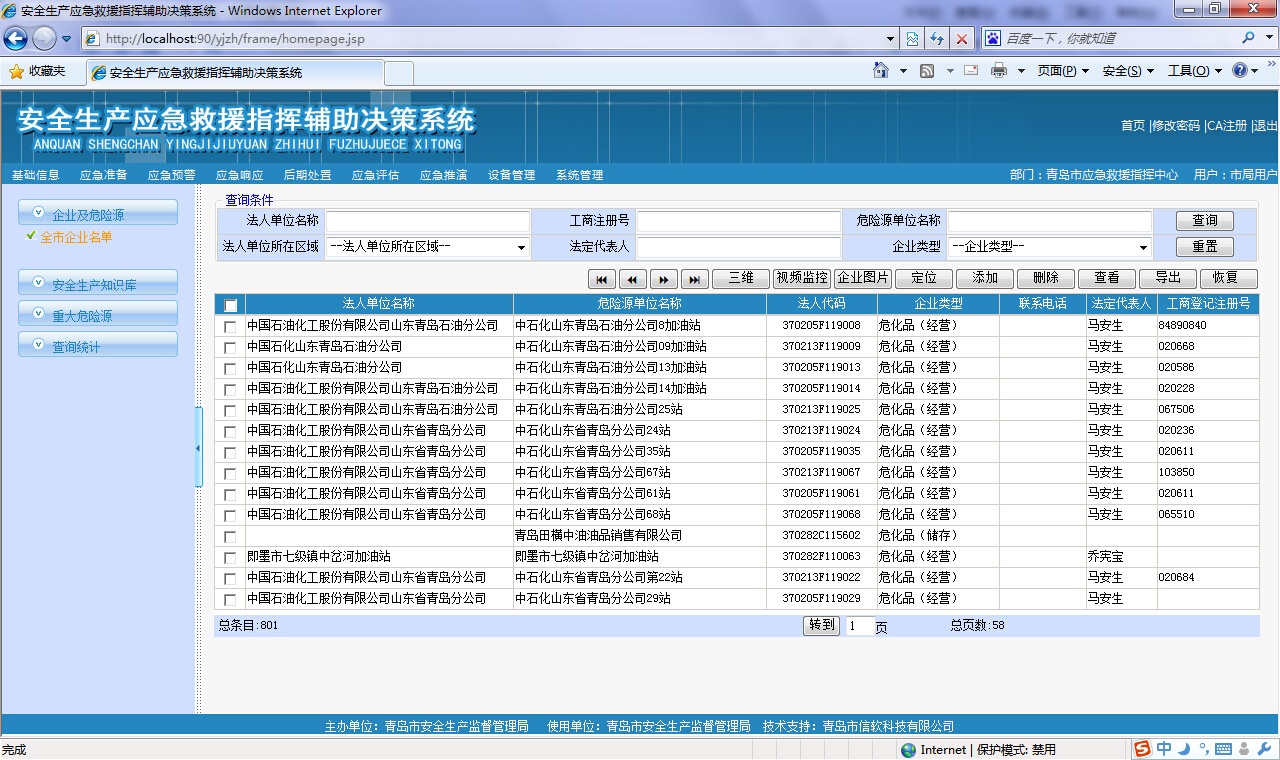 ? 對(duì)存在危險(xiǎn)源的企業(yè)進(jìn)行管理和查詢,可以按地區(qū)、經(jīng)濟(jì)類型、所屬行業(yè)等支持多種查詢條件進(jìn)行綜合查詢,查詢結(jié)果提供企業(yè)和所屬危險(xiǎn)源的具體信息、以樹(shù)形結(jié)構(gòu)展示單位基本情況、及其附屬的安全評(píng)價(jià)、行政許可等分類信息,方便政府主管部門(mén)查看危險(xiǎn)源企業(yè)的各種動(dòng)態(tài)情況??梢栽诰€查詢調(diào)閱危險(xiǎn)源視頻監(jiān)控信息、三維模型信息、GIS詳細(xì)信息,企業(yè)及危險(xiǎn)源信息可以導(dǎo)出到excel或者word中。