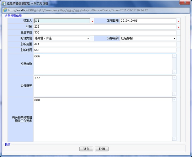 根據(jù)青島市發(fā)布的預(yù)警信息并結(jié)合安監(jiān)局業(yè)務(wù),提前發(fā)布一些預(yù)警信息或通過(guò)電話、傳真、手機(jī)、短信等方式,獲取預(yù)警信息。預(yù)警信息需要根據(jù)事態(tài)的進(jìn)一步發(fā)展核實(shí)后,根據(jù)系統(tǒng)權(quán)限,向應(yīng)急事件可能涉及的區(qū)域發(fā)布,當(dāng)預(yù)警結(jié)束后解除預(yù)警。